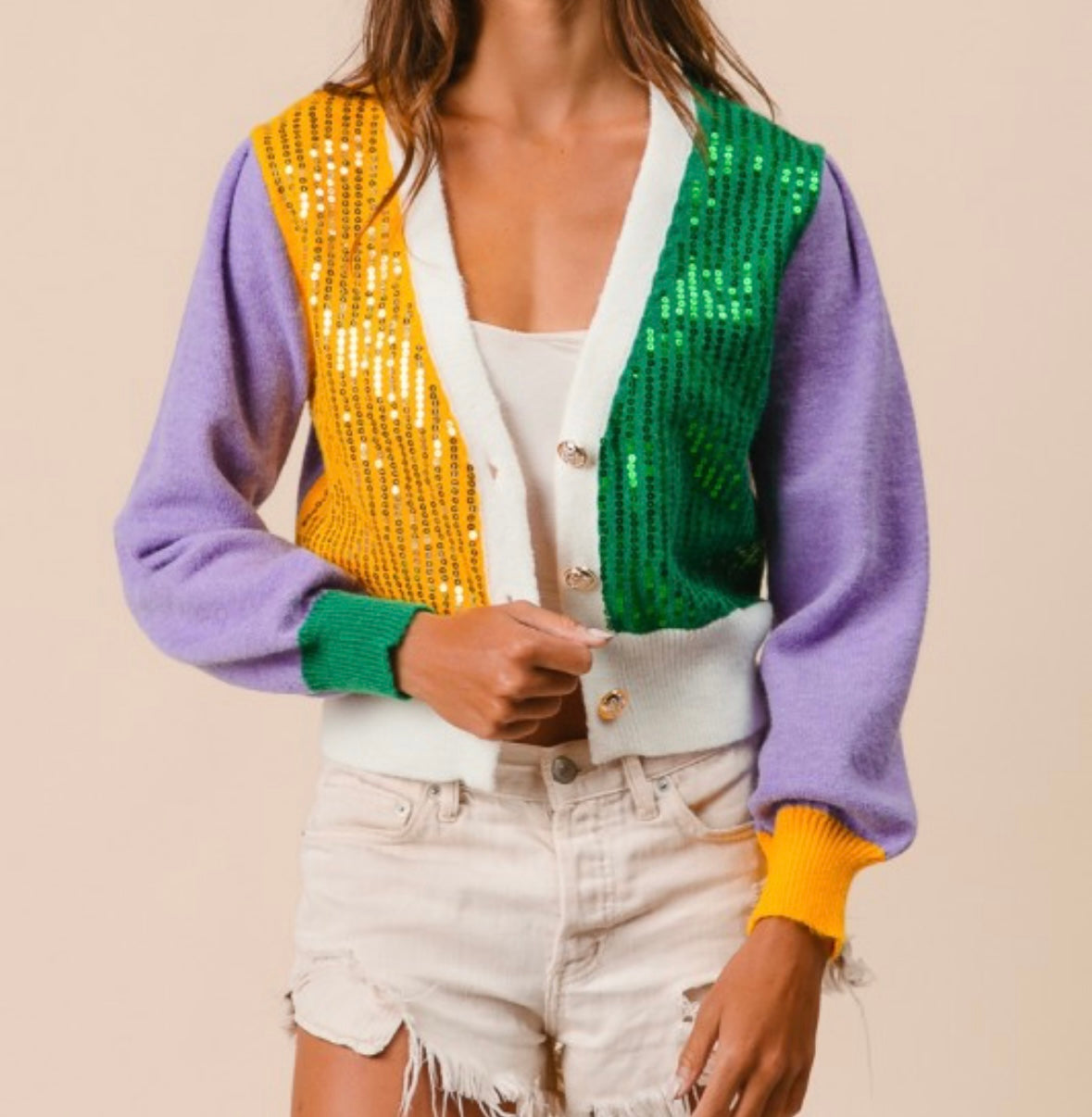 • Load image into Gallery viewer, Mardi Gras sequin sweater cardigan